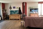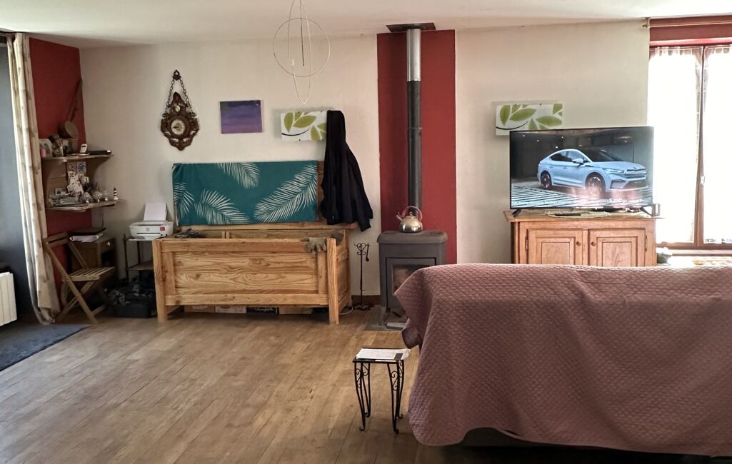 L’entrée mène à un vaste salon-séjour de 49 m², baigné de lumière et agrémenté d’un poêle à bois, créant une atmosphère conviviale. Une cuisine aménagée ouverte complète cet espace de vie.