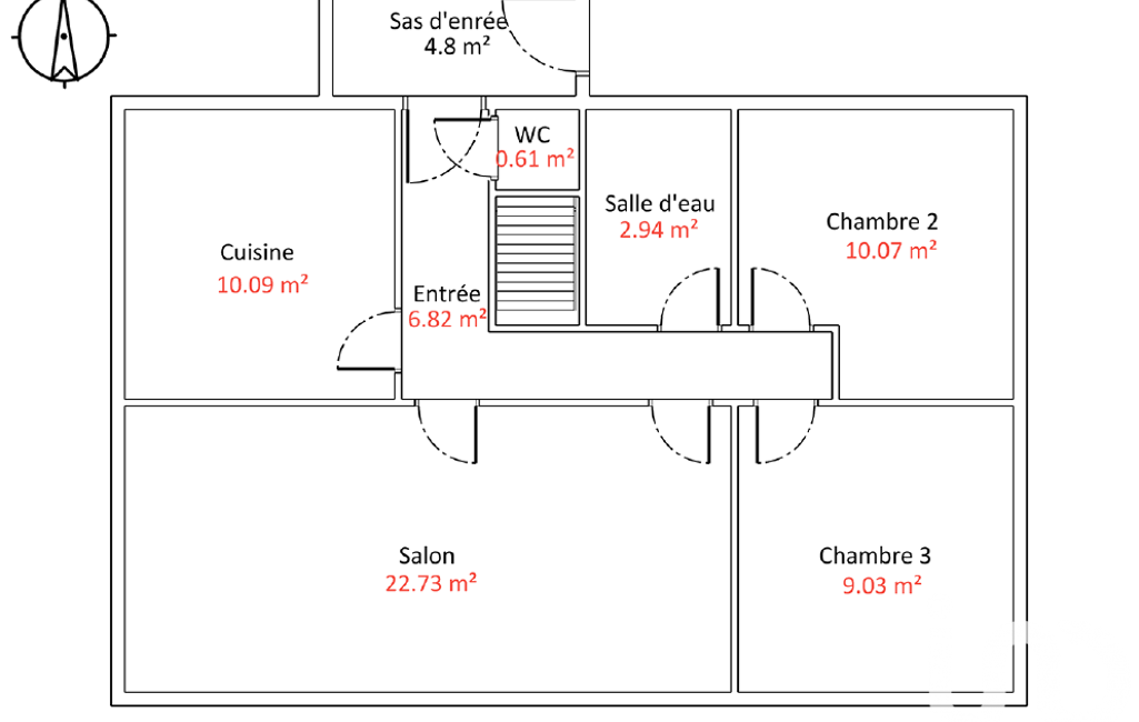 Au rez-de-chaussée surélevé, sas d'entrée, entrée, cuisine, wc, salon-séjour, salle d'eau, 2 chambres