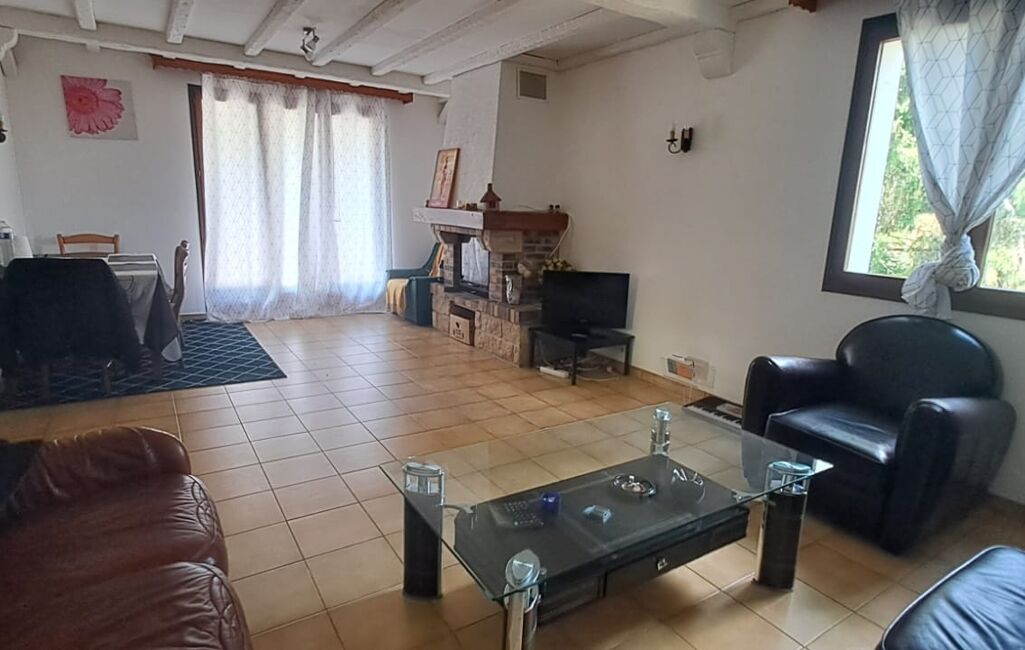 Un séjour lumineux avec cheminée insert, prolongé par un balcon avec vue sur les bois