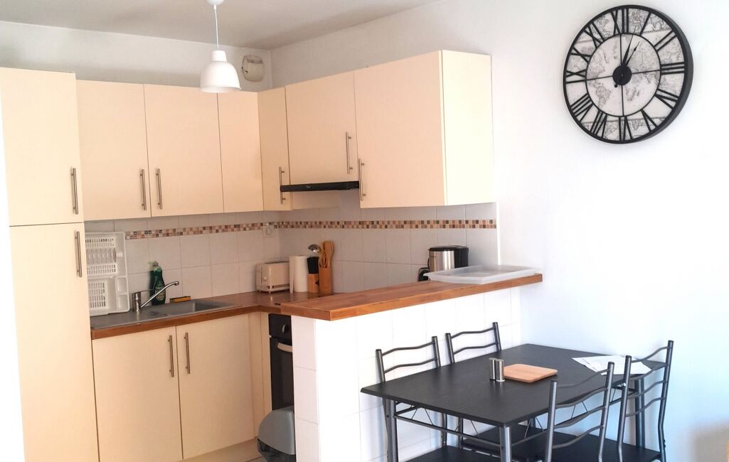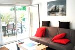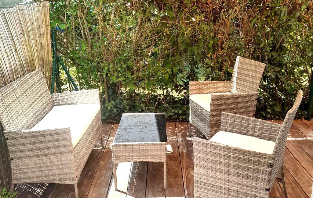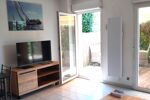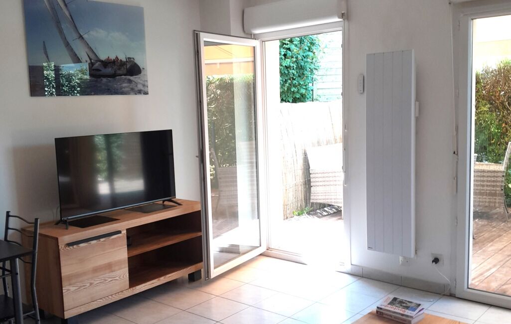 iad France - Guylaine Cerf vous propose: Appartement de type 2 meublé / 38,85m² lumineux, meublé entièrement se compose en RDC: d'une entrée avec placard, cuisine américaine équipée donnant sur une grande pièce de vie qui ouvre sur une belle terrasse équipée avec un store banne.