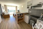Un salon spacieux et lumineux avec une kitchenette équipée incluant tout le nécessaire : évier, hotte, micro-ondes, lave-vaisselle, réfrigérateur et plaques de cuisson. Un coin repas avec une table à manger, un meuble TV, et un canapé convertible (couchage 2 personnes) en font un espace convivial et fonctionnel.