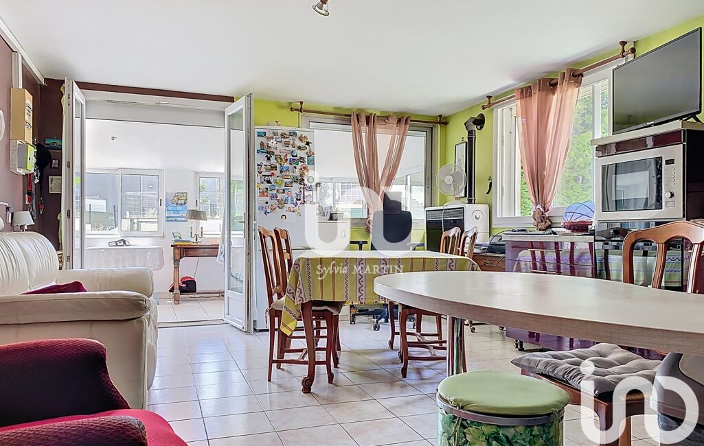 iad France - Sylvia MARTIN vous propose: Situé à Guillerval (13 minutes au sud-ouest d’Étampes), à deux pas de la gare, ce F3 en rez-de-chaussée d’env. 76 m² s’adresse clairement aux amateurs de lieux atypiques. Véranda d’entrée baignée de lumière, séjour avec cuisine aménagée/équipée d’env. 28 m², chambre avec salle d’eau et WC séparés. Salon de 23,53 m², ouvert sur une terrasse en bois, depuis lequel on accède à deux pièces annexes reliées aux combles aménageables (20 m2 environ). Cour privative au style brut, stationnements multiples, bâtiment de stockage, fibre, poêle à granulés et très faible taxe foncière complètent ce bien singulier.