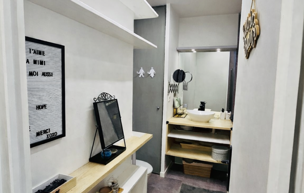Le coin nuit, parfaitement indépendant, est délimité par une porte coulissante de style industriel, apportant une vraie séparation tout en conservant une touche contemporaine.