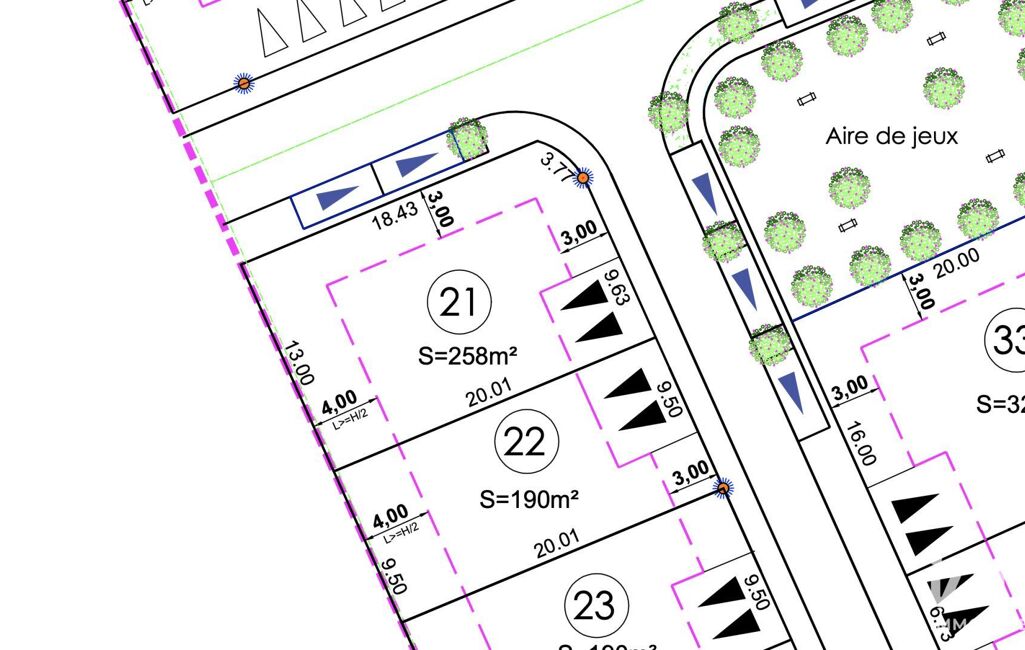 - 45 parcelles viabilisées (de 179 m² environ à 551 m² environ).