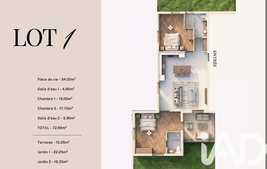 Ce logement d’une superficie de 72.90 m² se situe en rez de chaussée.