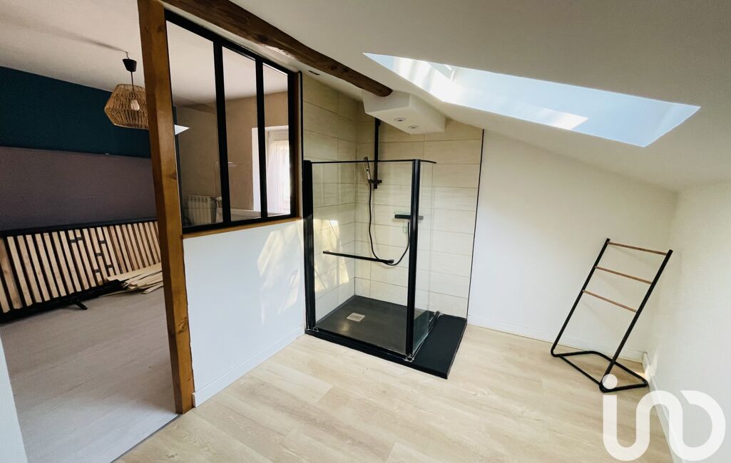 À l’étage : une chambre ouverte sur salle d’eau, WC séparé, et un espace bureau ou coin nuit (env. 8 m²).