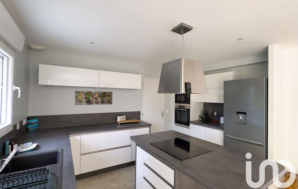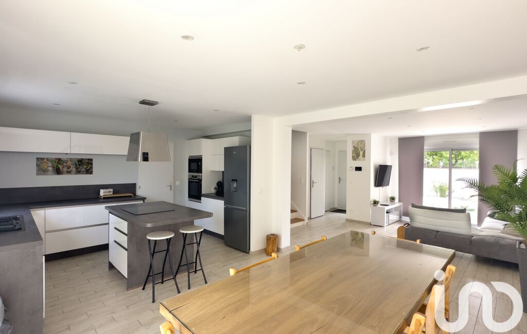 Au rez-de-chaussée : une entrée, un grand espace de vie de 46 m² comprenant un séjour, une salle à manger et une cuisine ouverte avec îlot central, une buanderie et un WC indépendant avec lave-mains.