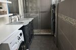 Une grande salle d’eau avec douche, meuble vasque et espace buanderie