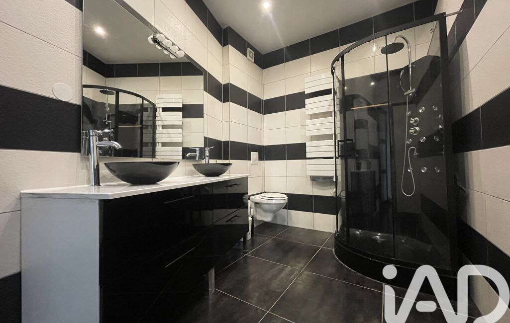 La salle de bain est équipée d’une douche, d’un WC et d’une double vasque, offrant confort et praticité au quotidien.