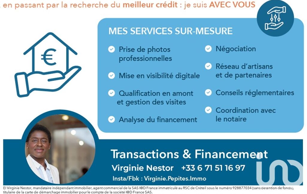 La présente annonce immobilière a été rédigée sous la responsabilité éditoriale de Mme Virginie Nestor mandataire indépendant en immobilier (sans détention de fonds), agent commercial de la SAS I@D France immatriculé au RSAC de CRETEIL sous le numéro 928877034, titulaire de la carte de démarchage immobilier pour le compte de la société I@D France SAS.