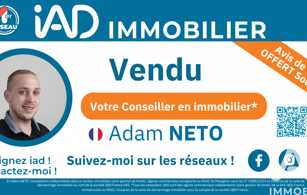 La présente annonce immobilière a été rédigée sous la responsabilité éditoriale de M Adam Neto mandataire indépendant en immobilier (sans détention de fonds), agent commercial de la SAS I@D France immatriculé au RSAC de Perpignan sous le numéro 938813433, titulaire de la carte de démarchage immobilier pour le compte de la société I@D France SAS.