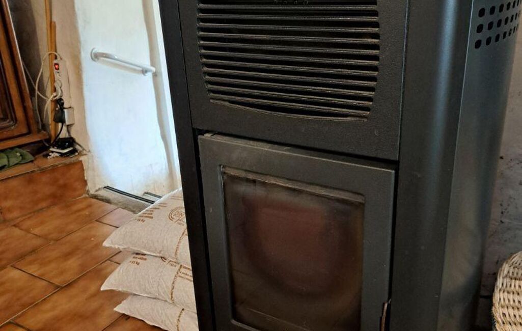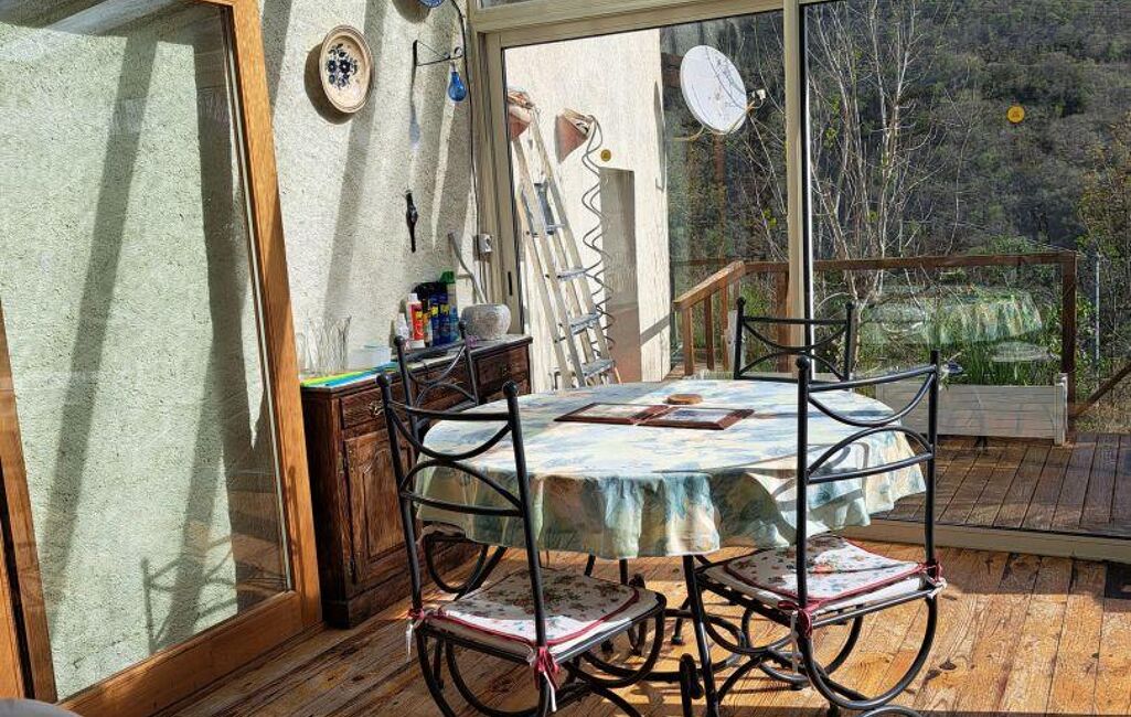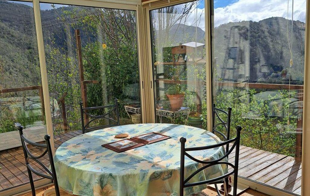 Au rez-de-chaussée se trouve une cuisine ouverte prolongée par une véranda lumineuse offrant une vue dégagée sur les montagnes. Le salon, d’une superficie de 24 m² environ et exposé sud-est, est équipé d’un poêle à bois et complété par un second système de chauffage au granulé, assurant une performance thermique adaptée aux variations saisonnières.