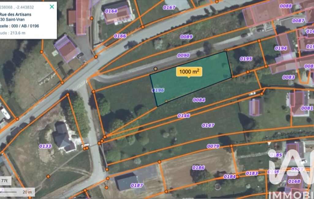 iad France - Stéphane Rouille vous propose: Terrain constructible de 1 000 m2 environ avec une bonne exposition et au calme dans le bourg de Saint Vran. Branchements eau,électricité,téléphone,assainissement à réaliser.