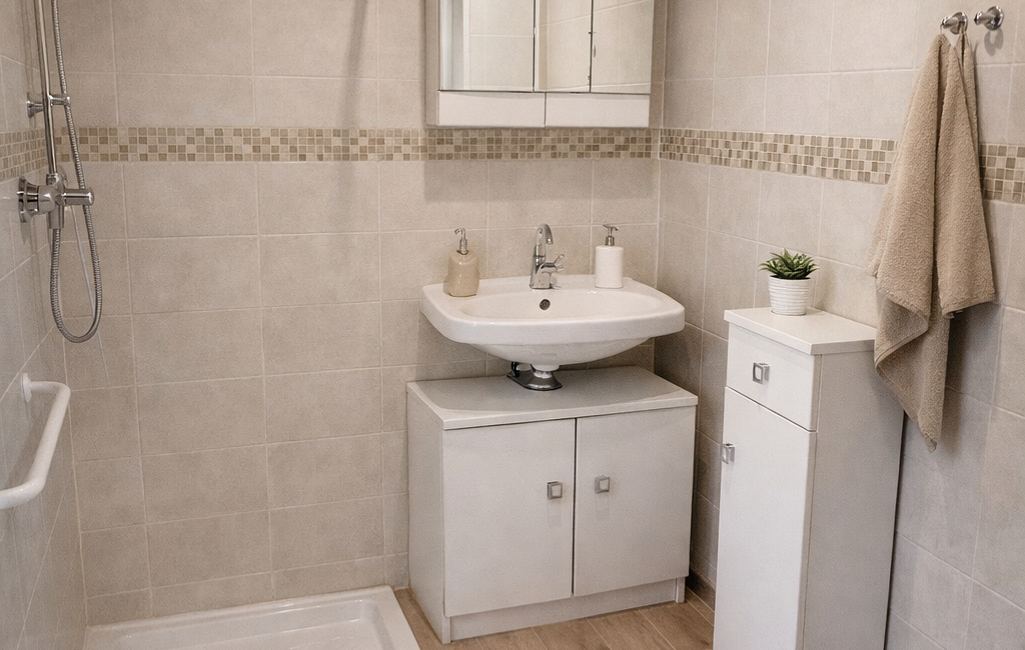 une cuisine indépendante, un salon, une salle d’eau avec WC et un cellier pratique au quotidien.
