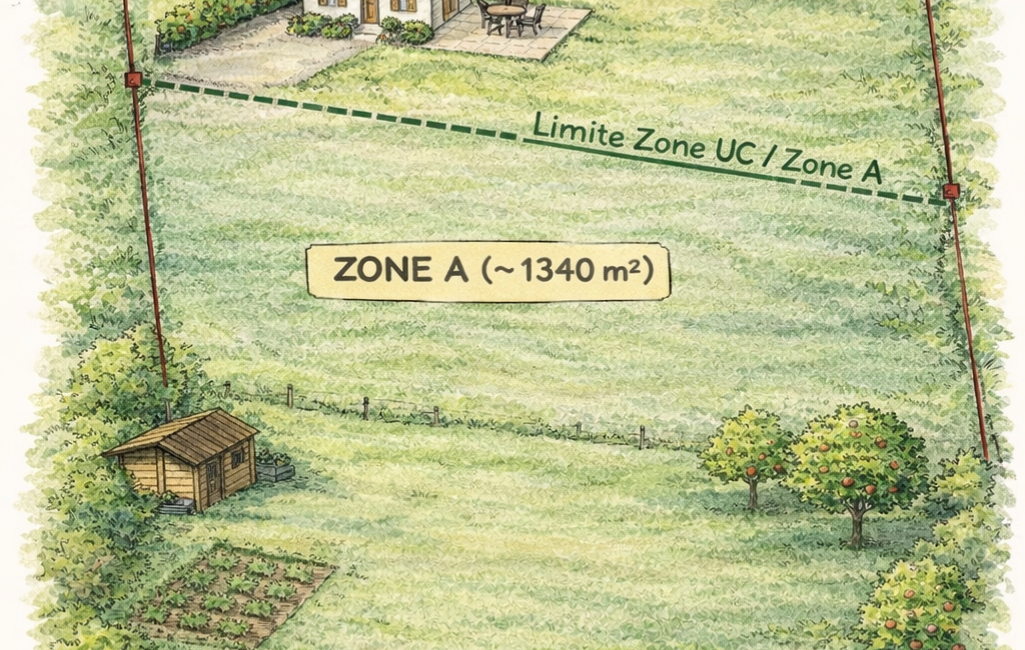 La parcelle comprend environ un tiers de surface constructible en zone UC, parfaitement adaptée à l’implantation d’une maison individuelle, avec garage et terrasse.