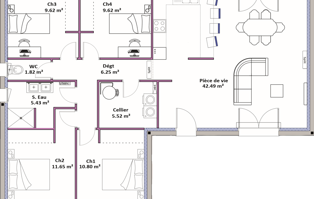 Cette maison familiale se distingue par sa modernité grâce à une architecture en L très tendance. Elle a été conçue et optimisée pour scinder au mieux l’espace de vie et l’espace de nuit avec ses 4 chambres. D’une superficie de 103m², cette maison propose des volumes généreux, quelque soit la pièce.
