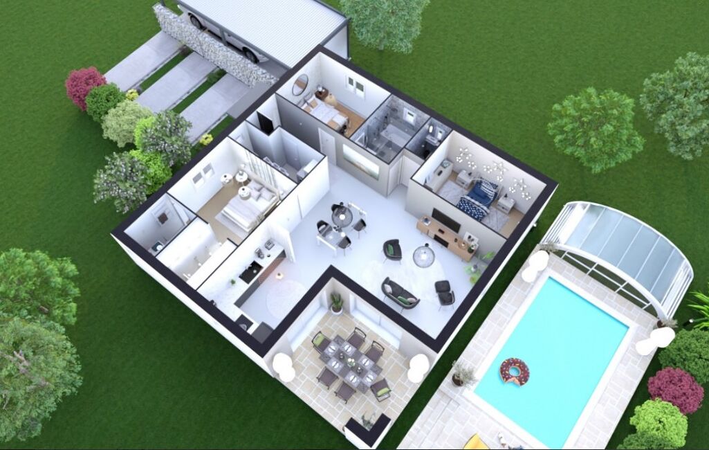 Terrain + maison, prix à partir de 221 300 euros - Garantie d'achèvement et de livraison à prix et délais convenus incluse - DO incluse - Branchements et Adaptation au sol inclus - Frais de notaire non inclus - Visuel non contractuel - Non mandaté pour la vente de ce terrain.