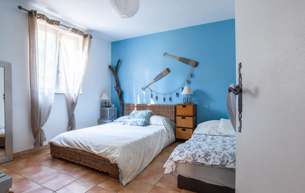 La partie nuit propose trois chambres de plain-pied ainsi qu'une salle de bains. À l'étage, une suite parentale avec salle d'eau privative garantit un espace intime et indépendant.