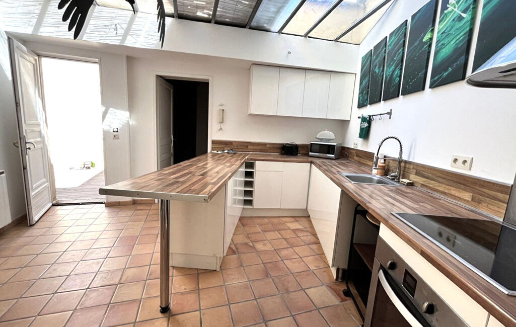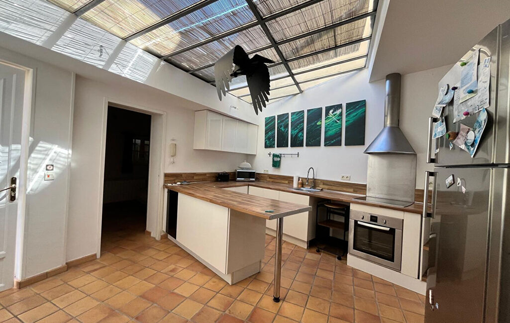 Une grande cuisine avec beaucoup de rangements et un plan de travail style bar avec un plafond verrière.