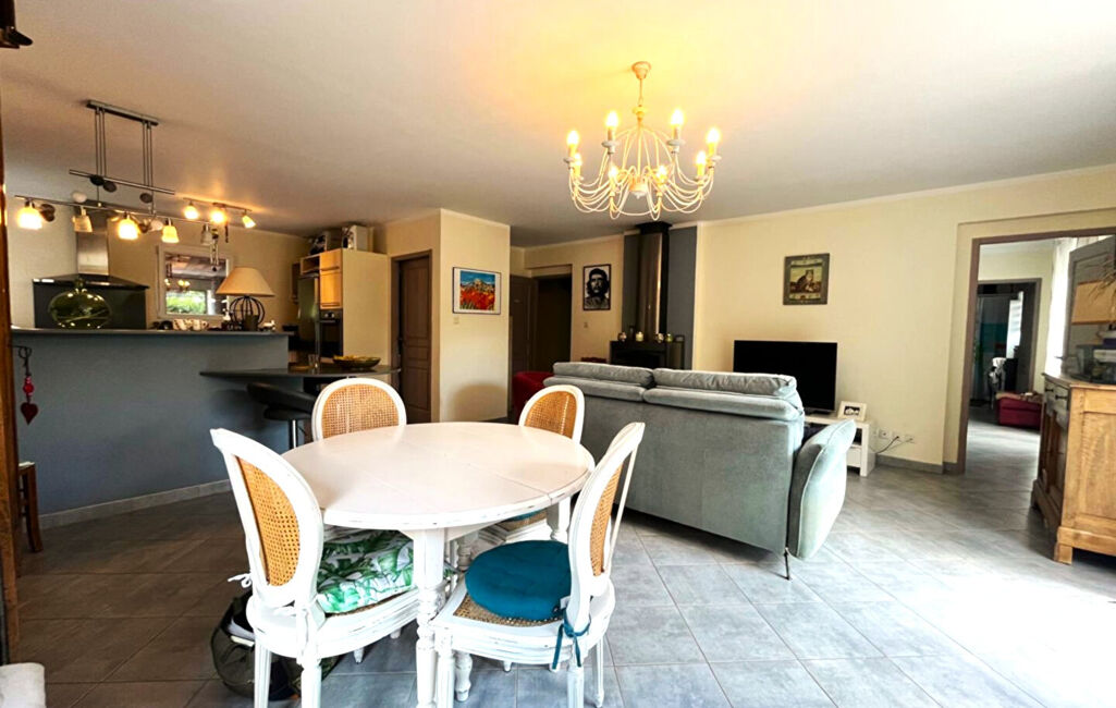 De l'autre côté , une pièce de vie avec cuisine aménagée et équipée ouverte sur le salon et la salle à manger.