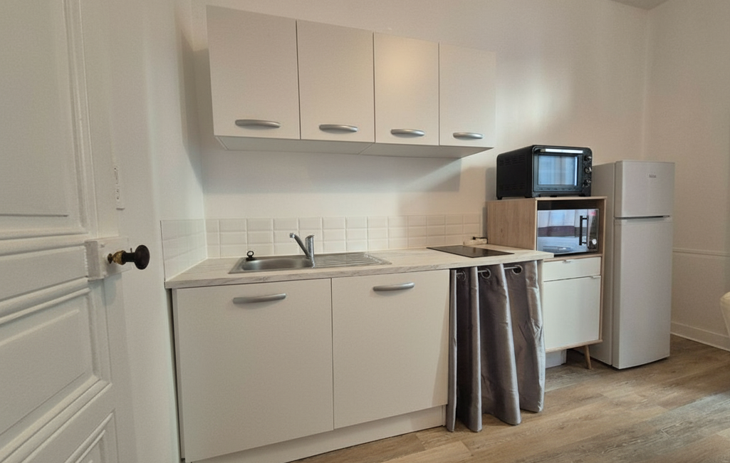 L'appartement se compose d'une pièce de vie lumineuse intégrant une kitchenette entièrement équipée, permettant de préparer vos repas en toute simplicité. La chambre séparée offre un espace intime et reposant. Une salle de douche moderne avec toilettes intégrées complète ce logement, alliant fonctionnalité et praticité.