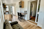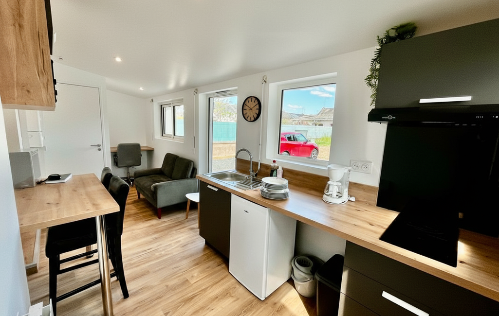 La cuisine, conçue sur mesure, est fonctionnelle et moderne. Elle est équipée d'une plaque à induction, d'une hotte aspirante, d'un réfrigérateur, d'un micro-ondes grill et de toute la vaisselle nécessaire. L'espace repas est aménagé avec une table et des tabourets de bar, créant un coin convivial.