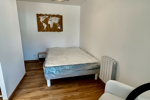 La chambre est aménagée avec un lit double, un fauteuil confortable et un dressing spacieux, offrant de nombreux rangements. Un espace bureau dédié, équipé d'une chaise, est également présent, idéal pour le télétravail ou les études. Le salon dispose d'un petit canapé et d'une table basse, invitant à la détente.