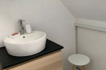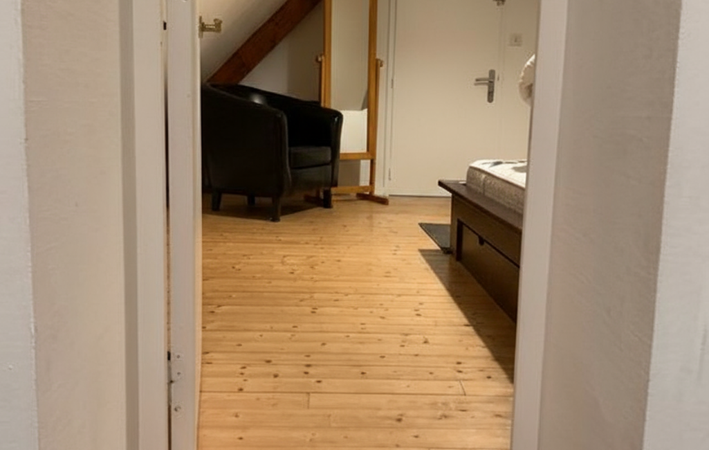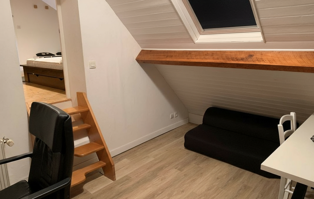 Le second espace est une chambre spacieuse de 16 m², aménagée avec un lit double confortable et des rangements pratiques, permettant d'organiser facilement vos effets personnels. Pour un confort optimal, une salle de bain et des toilettes privatives sont situées sur le palier, garantissant intimité et commodité.