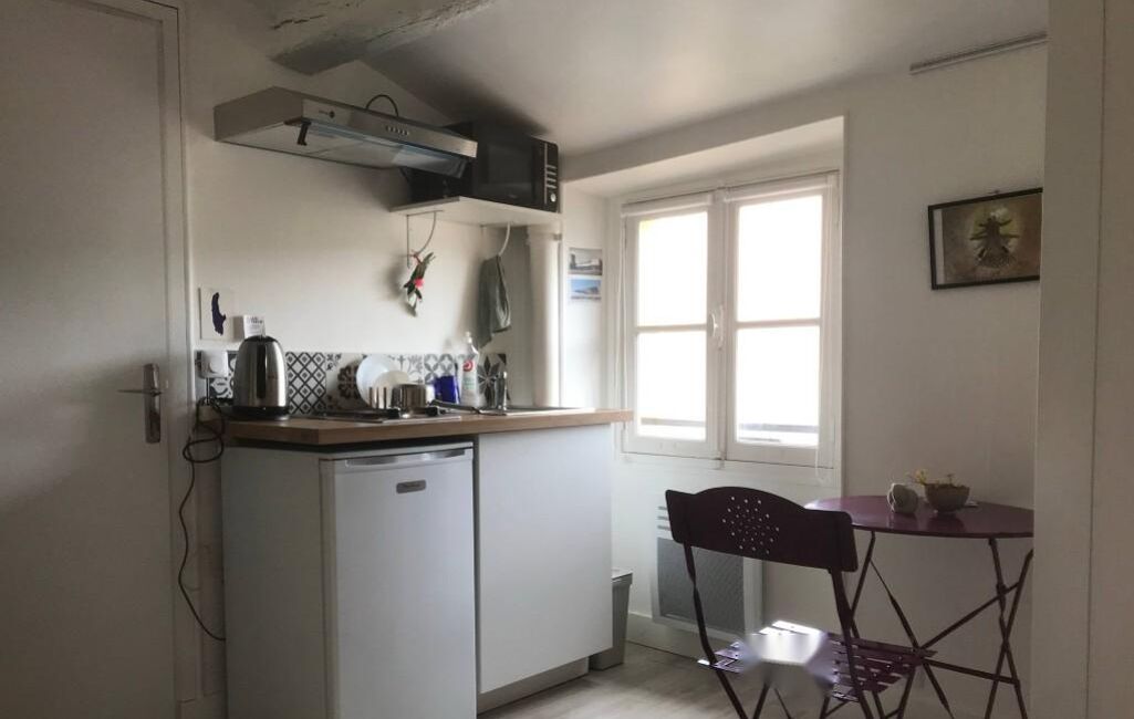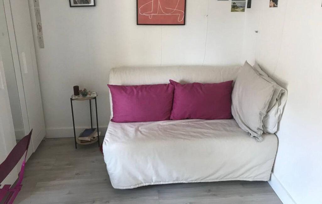 L'agencement intérieur a été optimisé pour offrir un espace fonctionnel et confortable. La pièce principale, véritable cœur du studio, intègre harmonieusement un espace nuit avec un canapé-lit convertible, un coin bureau propice à l'étude ou au télétravail, et une kitchenette entièrement équipée. Cette dernière comprend les éléments essentiels pour préparer vos repas quotidiens, optimisant ainsi l'espace de vie.
