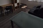 L'intérieur du studio est agencé de manière fonctionnelle et lumineuse. La pièce principale intègre un coin cuisine entièrement équipé, comprenant une table, des chaises, un réfrigérateur, une plaque de cuisson, un micro-ondes/grill et une cafetière. Le coin salon est aménagé avec un canapé BZ doté d'un matelas Simmons, des étagères et un bureau, créant un espace de vie confortable et propice à l'étude. Un placard intégré offre des rangements pratiques pour optimiser l'espace.