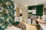 Le séjour est astucieusement agencé pour optimiser l'espace. Il comprend un coin cuisine entièrement équipé avec un micro-ondes, une plaque à induction, une hotte aspirante, un réfrigérateur et un plan de travail fonctionnel. Un bureau est également intégré, idéal pour le télétravail ou les études. Un dressing offre des solutions de rangement pratiques, et un lit simple assure un repos confortable. Le sol est revêtu d'un élégant parquet, ajoutant une touche chaleureuse à l'ensemble.