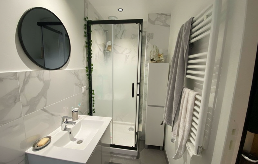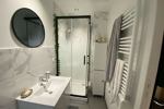 La salle de douche, moderne et fonctionnelle, est équipée d'une douche avec paroi, d'une vasque, de toilettes, de meubles de rangement, d'un sèche-serviettes et d'un miroir. Le carrelage au sol complète l'esthétique soignée de cette pièce. Chaque pièce est dotée d'un système de VMC pour une ventilation optimale, et l'éclairage, les radiateurs et le chauffe-eau sont conçus pour une basse consommation énergétique.