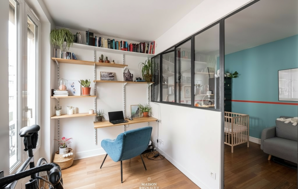 L'espace nuit se distingue par son agencement atypique et particulièrement astucieux, offrant l'équivalent de deux espaces de repos distincts. Vous profiterez tout d'abord d'une véritable chambre séparée, offrant un cocon de tranquillité et garantissant calme et intimité. De plus, l'appartement dispose d'un espace polyvalent très recherché comprenant un coin bureau, idéal pour les journées de télétravail, ainsi qu'un second coin nuit. Cet espace est élégamment délimité par une magnifique verrière de style atelier, qui permet de conserver toute la clarté naturelle de la pièce tout en créant une séparation visuelle très esthétique et moderne.