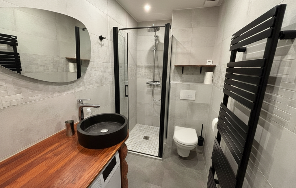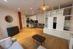 L'entrée de l'appartement se fait au 2e étage, accessible par ascenseur en demi-étage, et s'ouvre sur un espace de vie lumineux de 30 m². Cet étage comprend une entrée accueillante avec un meuble à chaussures pratique, une cuisine ouverte entièrement équipée et aménagée. La cuisine dispose d'une hotte, de plaques à induction, d'un réfrigérateur-congélateur, d'un lave-vaisselle, d'un four et d'un micro-ondes, complétés par de nombreux placards de rangement et un plan de travail avec des chaises hautes, idéal pour les repas rapides. Le salon attenant est aménagé avec une grande bibliothèque, un canapé confortable et une table à manger dépliante, offrant flexibilité et convivialité.