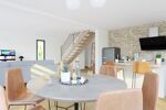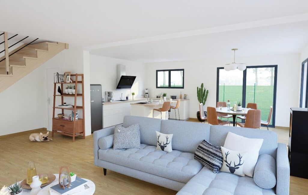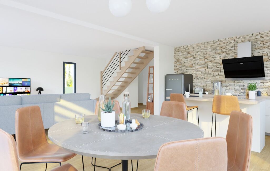 Maison sous RE 2020 : briques, débords PVC, volets roulants électriques, carrelage grand format, parquet dans les chambres. Et bien d'autres prestations à découvrir.