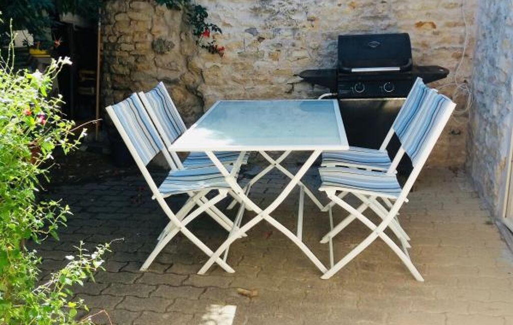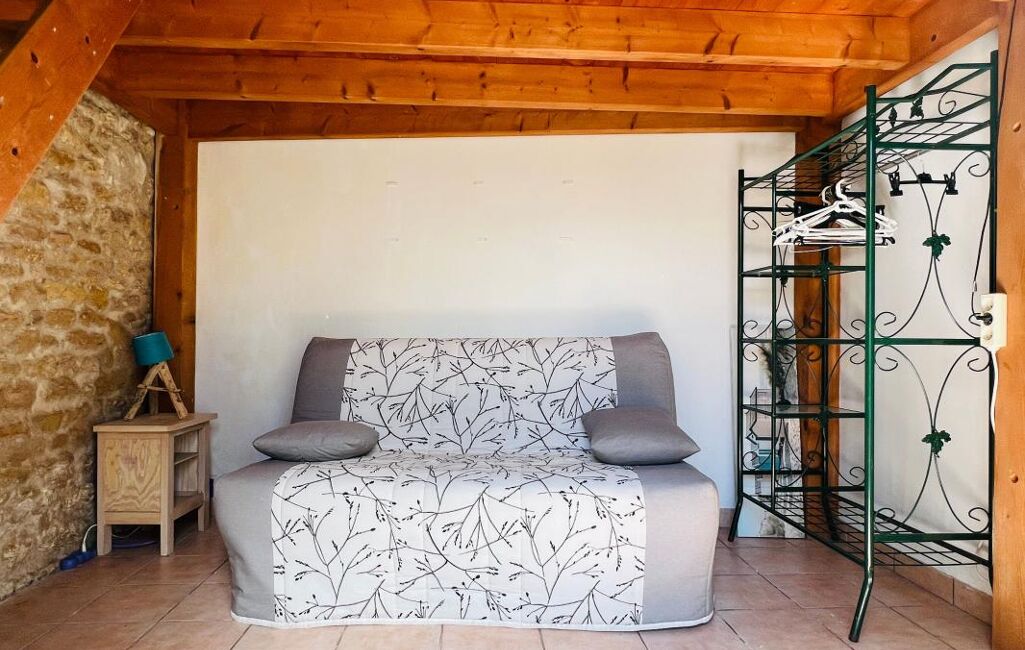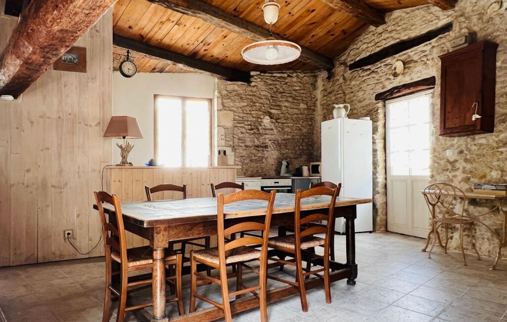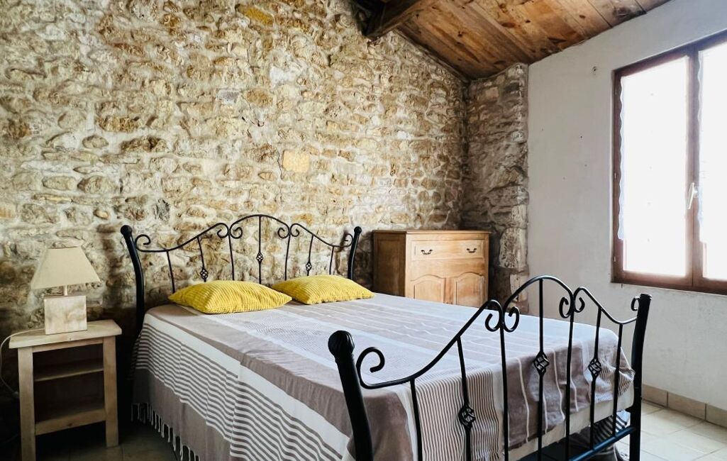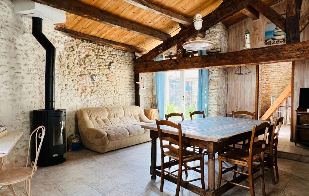 Centre village, maison ancienne comprenant une pièce de vie avec cuisine ouverte, poêle à bois, deux chambres dont une avec espace mezzanine, salle d'eau avec wc, cour. Beaucoup de charme !