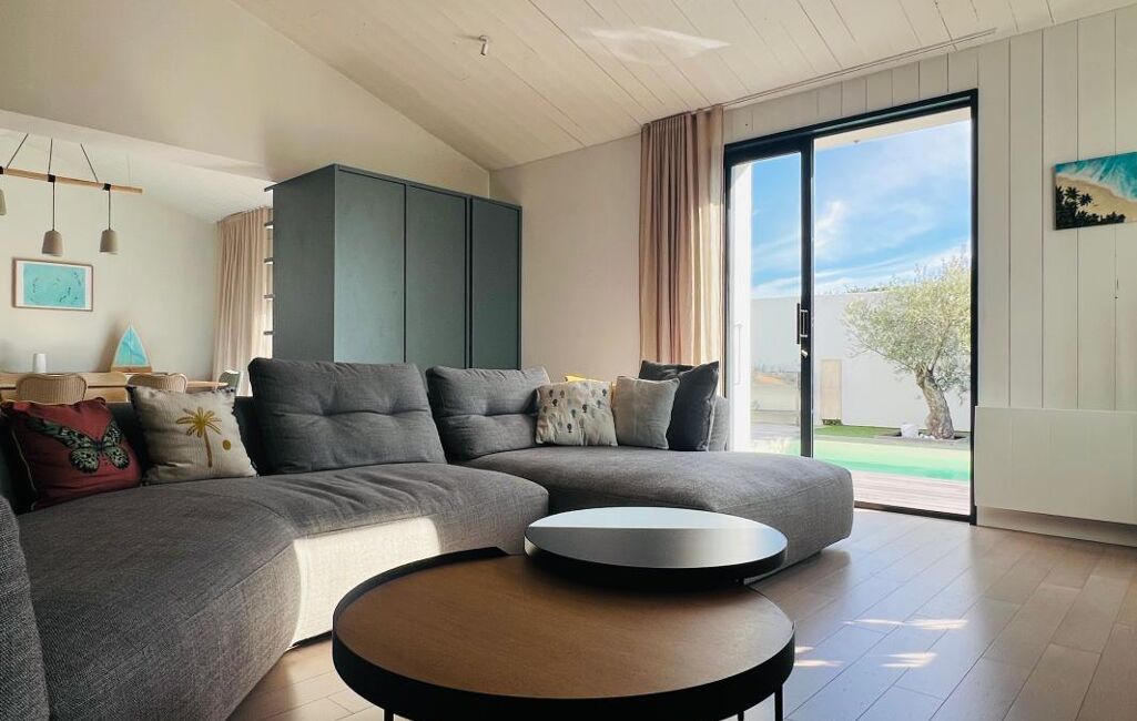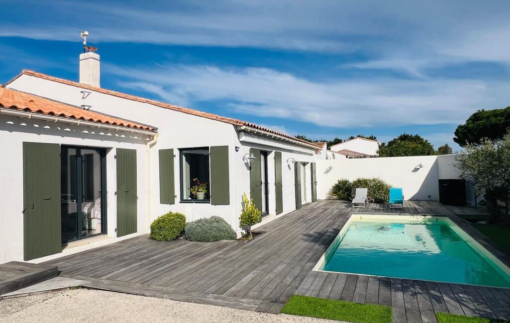 Idéalement située proche de l'océan, maison de plain-pied composée d'un patio d'accueil, d'un séjour avec cuisine ouverte, poêle à bois, salle à manger, deux chambres en suites, dressing traversant, deux wc, buanderie, à l'étage un bureau pouvant être transformé en chambre. Jardin exposé plein sud, piscine chauffée, garage.
