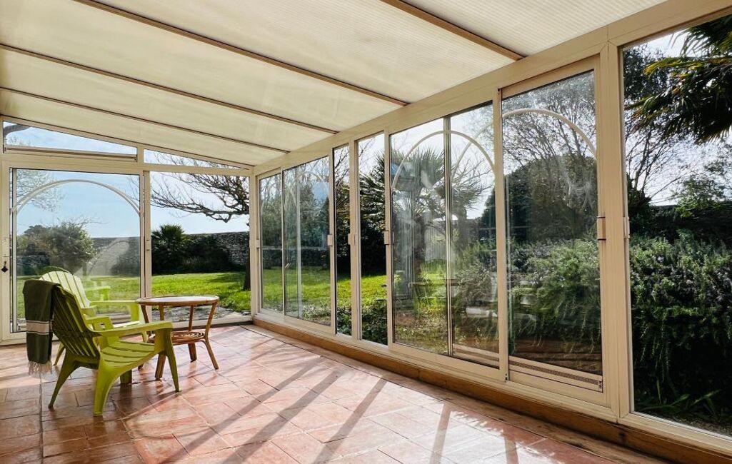 Maison comprenant un grand séjour lumineux avec cheminée, une cuisine et son cellier, deux chambres dont une avec placard, une salle d'eau, un WC séparé et une belle véranda donnant sur un magnifique jardin clôturé de murs en pierre.