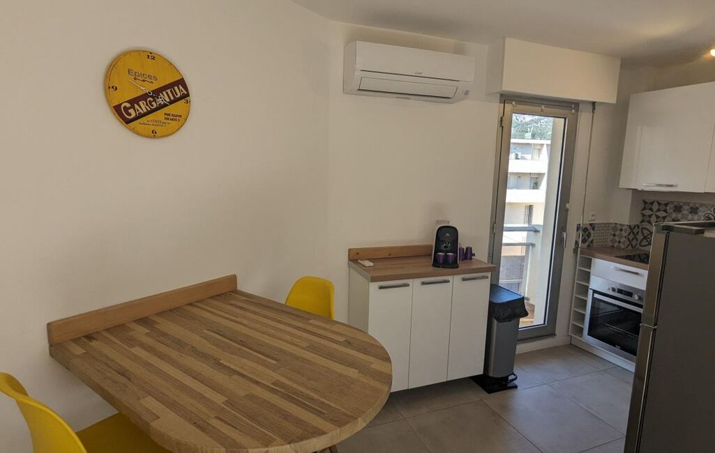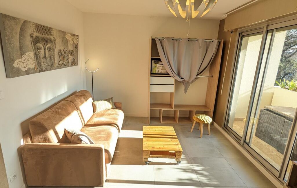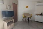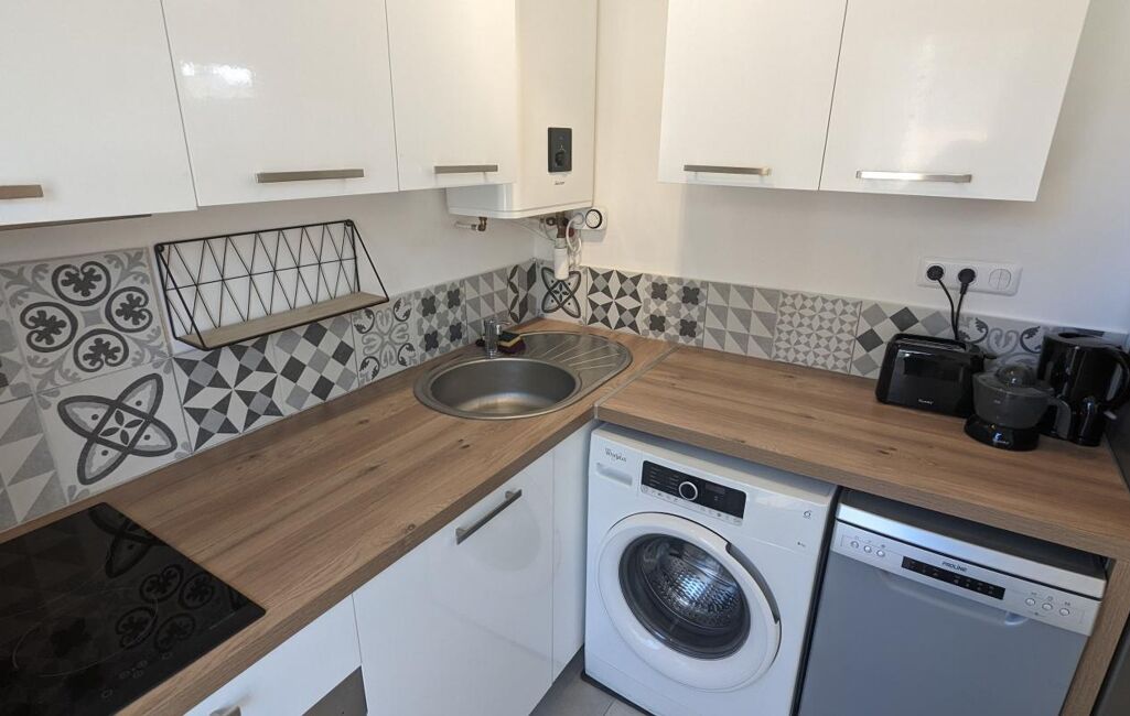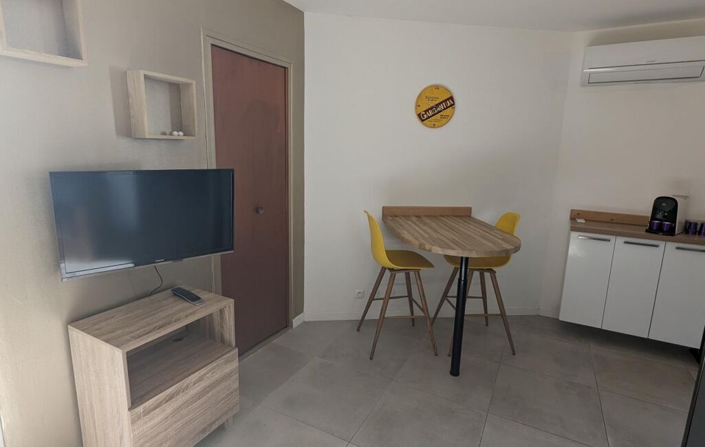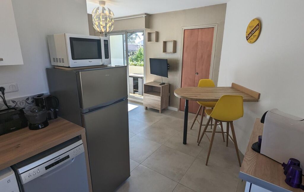 En excellent état, ce logement moderne et lumineux se compose d'une belle pièce de vie avec un canapé-lit de qualité donnant sur la terrasse, un coin cuisine équipée et aménagée comprenant lave-linge, lave-vaisselle, four, micro-ondes, réfrigérateur, plaques de cuisson ainsi que de nombreux rangements.