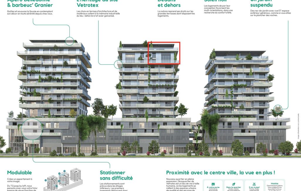 Les logements offrent en tout lieu un panorama époustouflant. Points de fixation depuis la skyline urbaine. Françoise, Ernestine et Gabrielle sont trois marqueurs ou renouvellement de Vetrotex. Les appartements les plus bas étant situés en moyenne au niveau des derniers étages des immeubles voisins, seules les montagnes constituent une barrière à votre nouvel horizon.