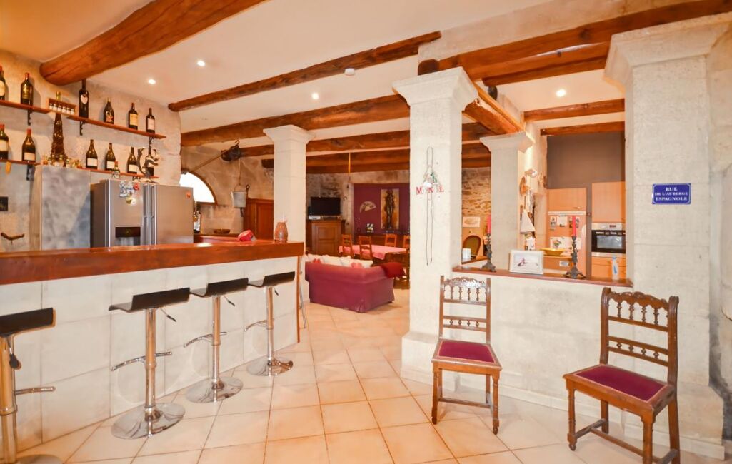 Au rdc, un garage, une grande et majestueuse entrée ouvrant sur pièce de vie avec cheminée, un salon tv, un bar, une pièce d'eau avec toilettes, une cuisine indépendante équipée, aménagée et un atelier.