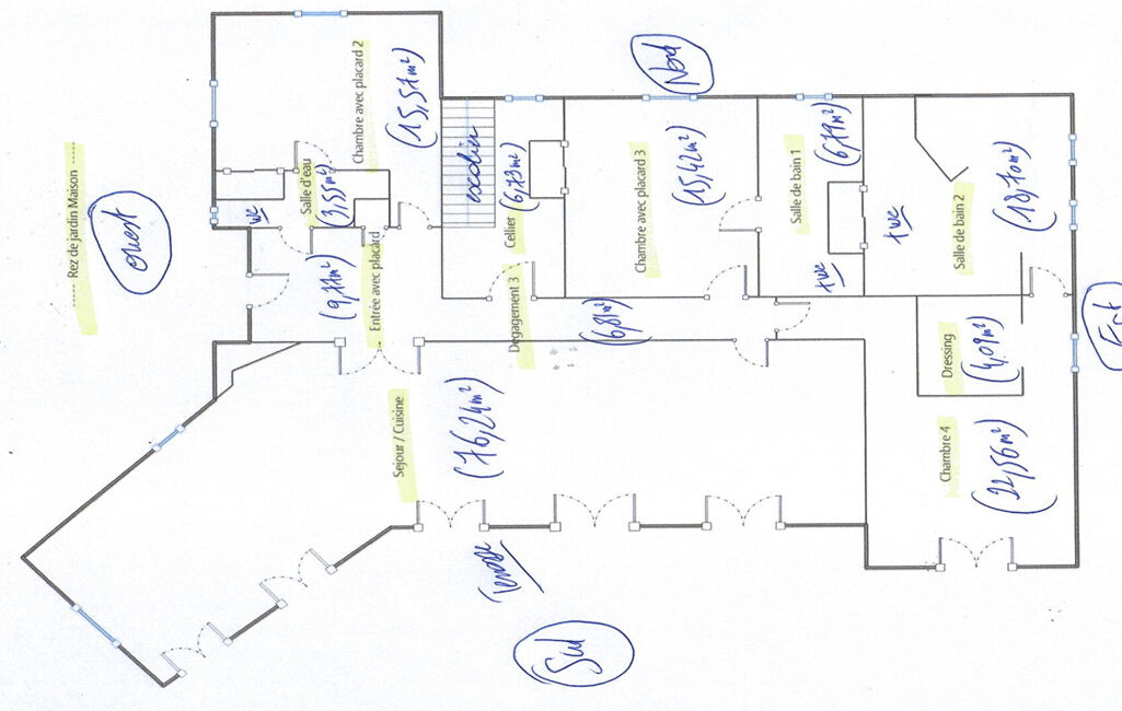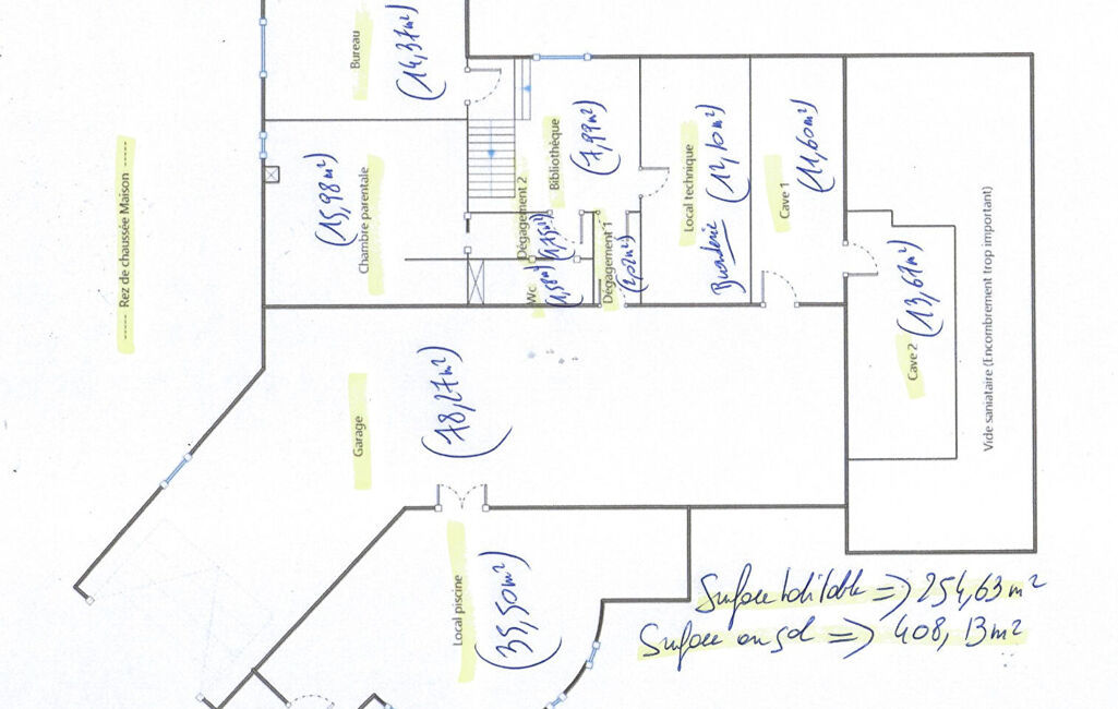 En rez-de-jardin : un bureau, une chambre parentale, deux caves, un garage de 78 m² et un atelier de 35 m².