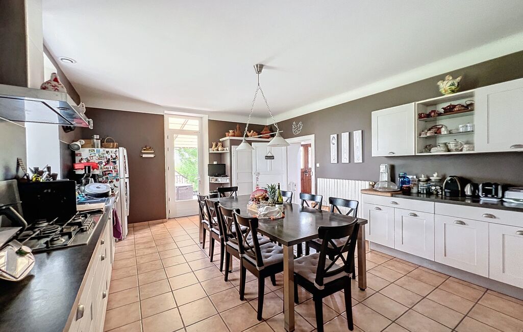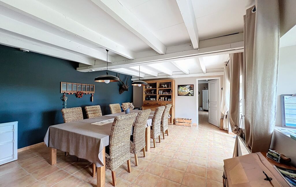 Au rez-de-chaussée Une grande cuisine semi professionnelle équipée avec cellier (30 m²) Une grande salle à manger-salon avec cheminée à insert (40 m²) Une buanderie avec toilettes (10 m2) Une terrasse de 30 m² attenante à la cuisine offrant une vue sublime sur la campagne vallonnée au départ de nombreuses randonnées.