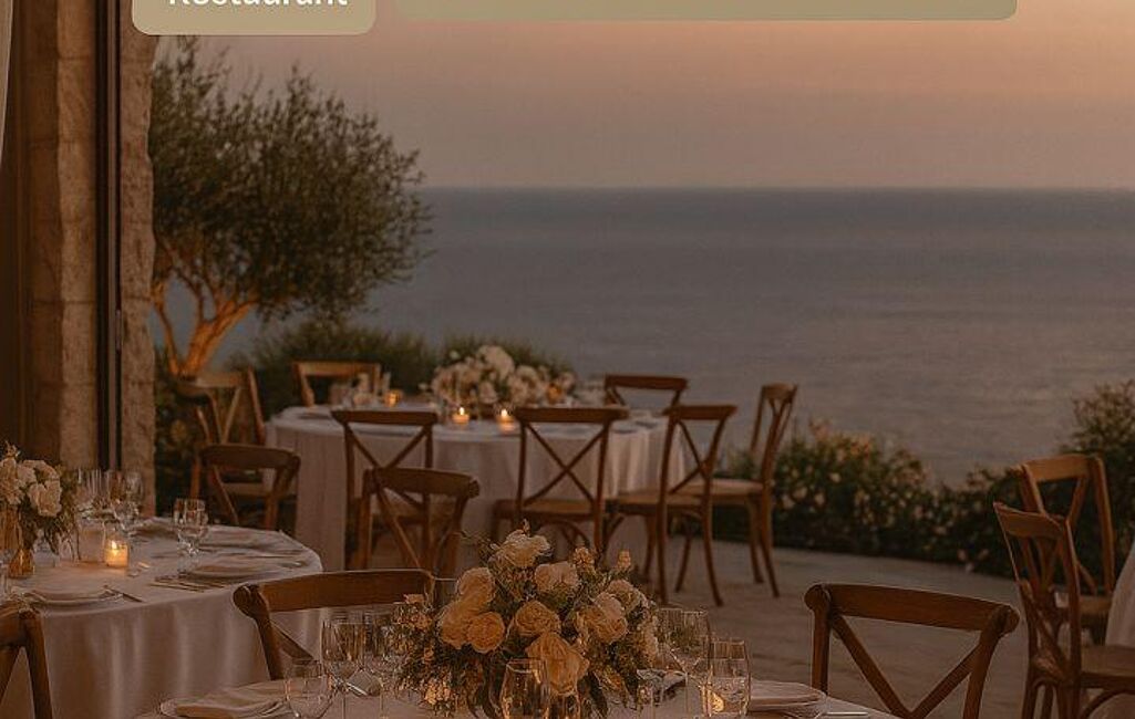 Le bâti d’environ 500 m² environ s’organise autour d’un restaurant gastronomique “farm-to-table” et d’une salle de réception panoramique ouverte sur la mer , terrasses et rooftop prolongent l’expérience gourmande sous le ciel azuréen. Une boutique terroir et une cave à vins climatisée complètent l’offre, valorisant les produits biologiques cultivés directement sur la propriété – fruits, légumes, huile d’olive et miel – pour un storytelling durable et haut de gamme.