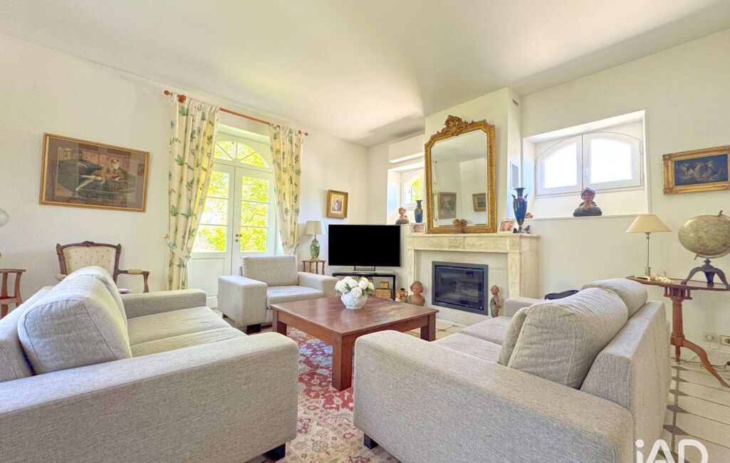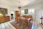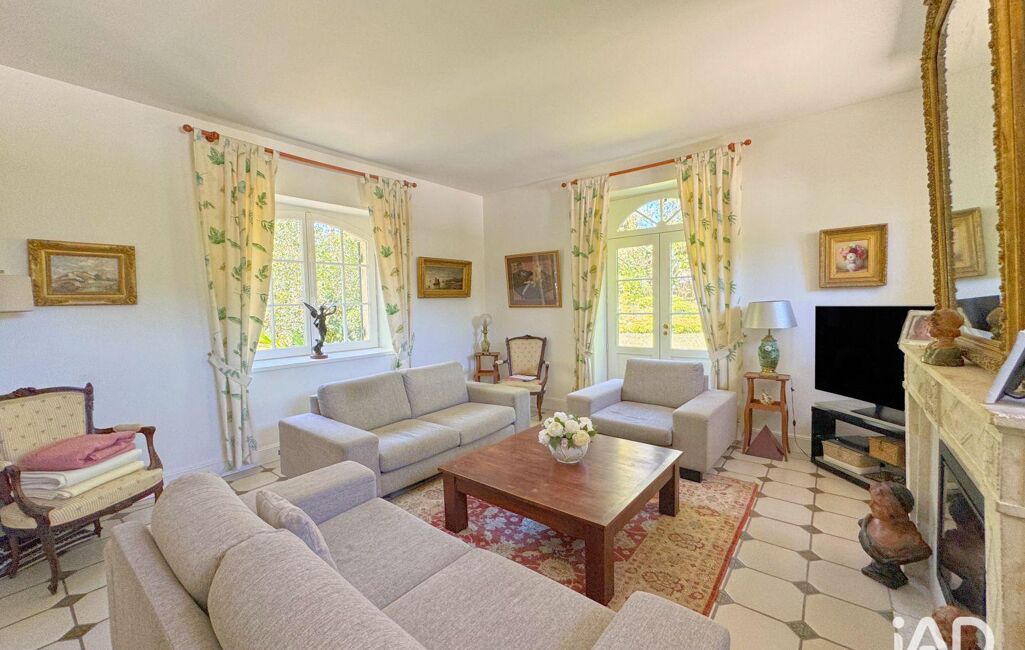 L’organisation intérieure privilégie une vie de plain-pied. L’entrée distribue des espaces de réception lumineux, ouverts sur le jardin. Le salon, articulé autour d’une cheminée en pierre, installe une atmosphère feutrée. La salle à manger prolonge ces volumes avec fluidité. Les ouvertures cintrées encadrent les vues et laissent entrer une lumière constante.