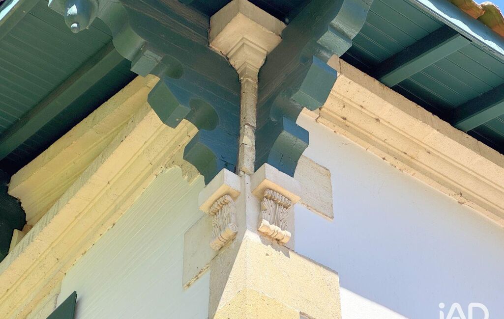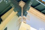 L’architecture affirme une identité singulière : débords de toiture travaillés, aisseliers sculptés aux lignes courbes régulières, consoles ornées de motifs végétaux stylisés inspirés du vocabulaire classique. L’ensemble compose une façade structurée, élégante sans ostentation, où le bois peint dialogue avec la maçonnerie.
