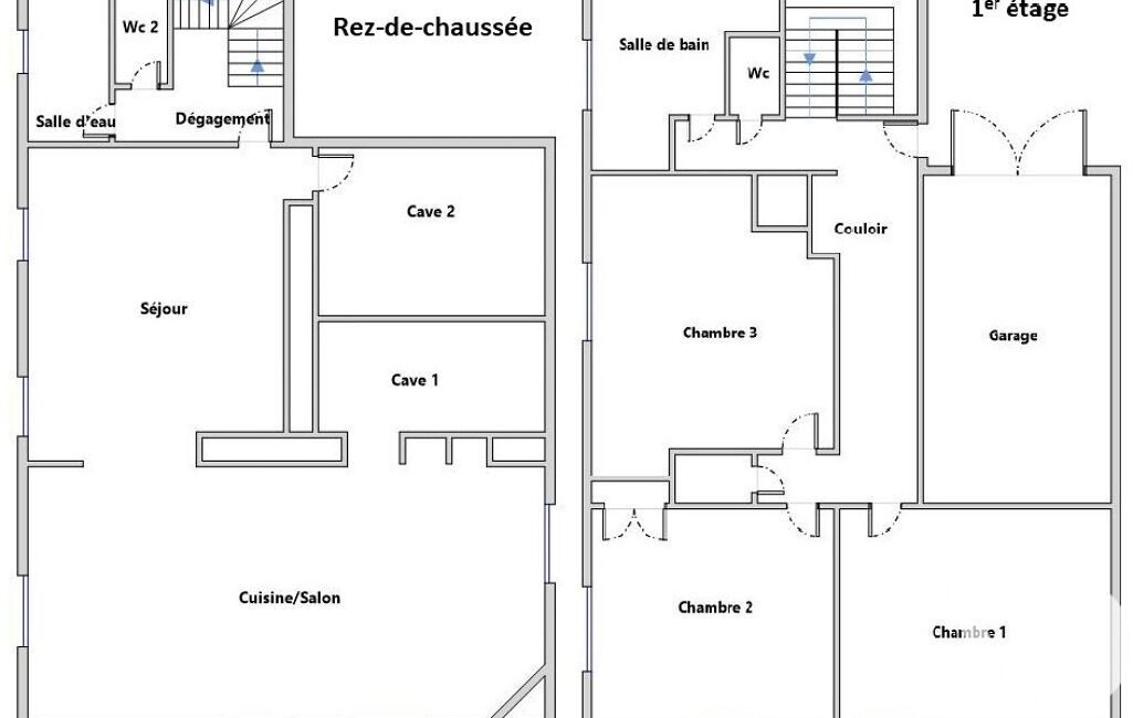 La maison se compose au rez-de-chaussée d'une cuisine équipée ouverte sur une salle à manger de 32 m2, d'un cellier, d'un salon de 22m2, d'une buanderie, d'un WC et d'une cave.