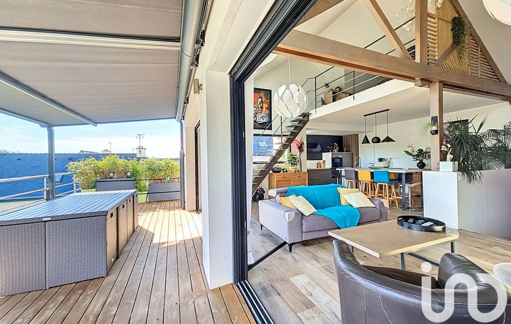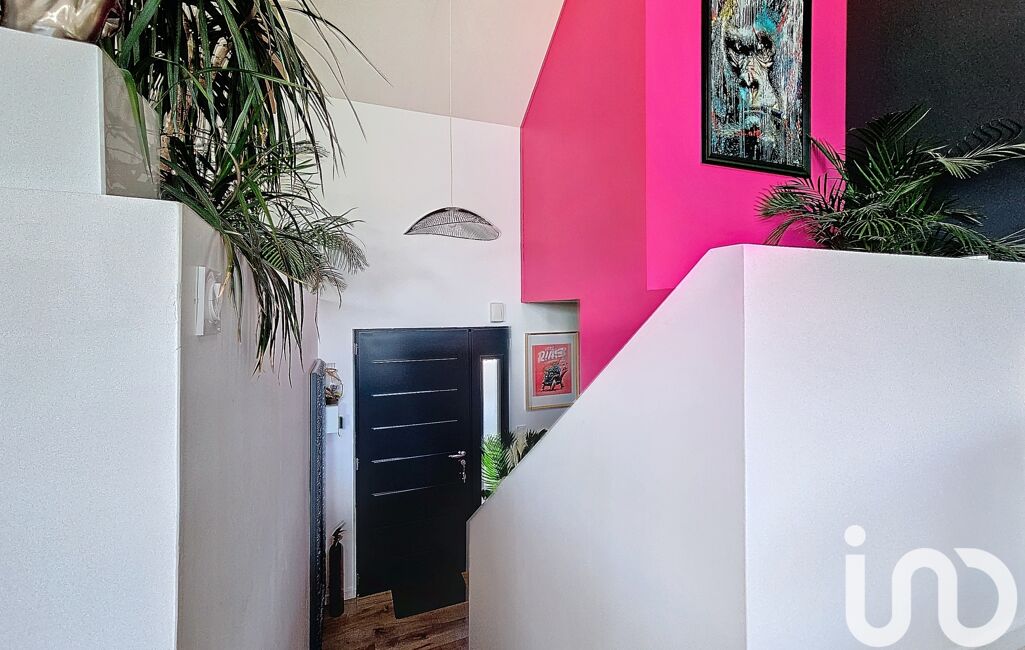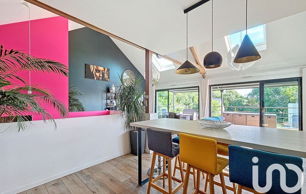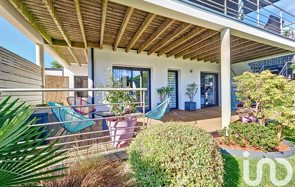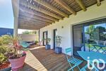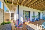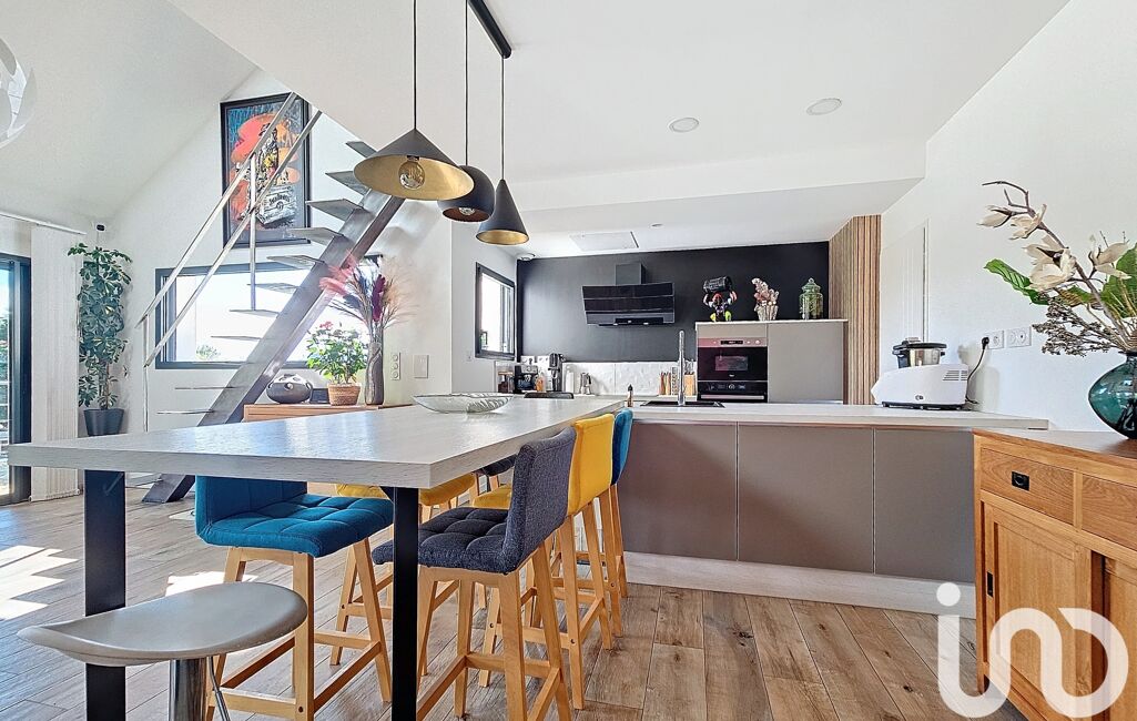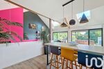 Une entrée en demi-niveau nous guide à l'espace central de la maison : sa pièce de vie sous un plafond cathédrale, totalement ouverte sur sa spacieuse terrasse. Une cuisine aménagée et équipée mène à un cellier.