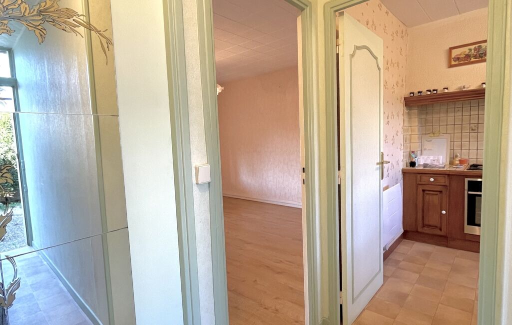 Composée en rez-de-chaussée d'une entrée, WC1, cellier1, cuisine aménagée et équipée fonctionnelle des années 80, vaste salon/séjour de 20m2 baigné de lumière et donnant accès à la petite véranda côté jardin.