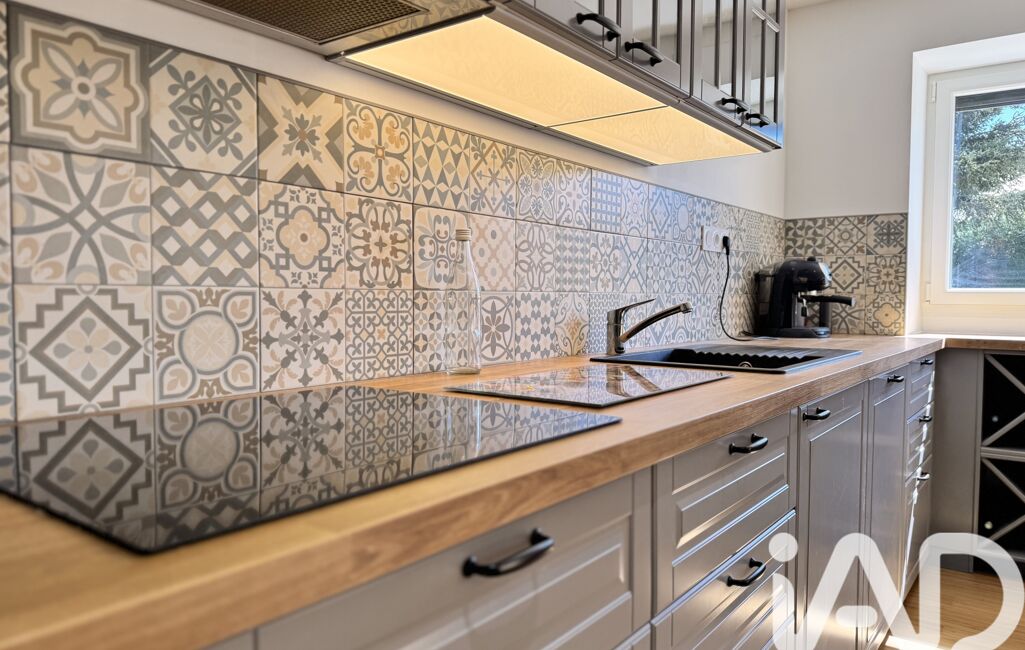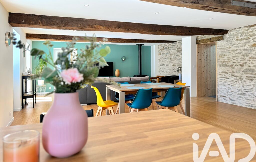 La pièce de vie spacieuse et chaleureuse, agrémentée d’un poêle à bois, s’ouvre sur une cuisine aménagée et équipée avec espace de rangement, créant un lieu de vie convivial et fonctionnel.